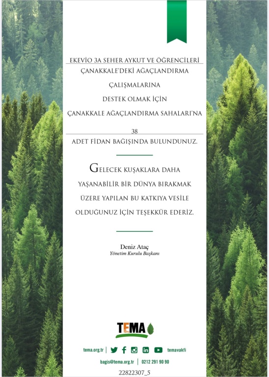 Temel Eğitim Genel Müdürlüğü tarafından hazırlanan , okulların açıldığı ilk gün tüm sınıflarımız "Yeşil Vatan İlk Dersimiz" konulu etkinliklerini yaptılar.Bu çerçevede 3A Sınıfı ve Öğretmenleri TEMA vakfı aracılığı ile Çanakkale Ağaçlandırma Çalışmasına 38 adet fidan bağışında bulundular.